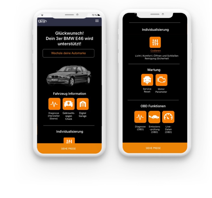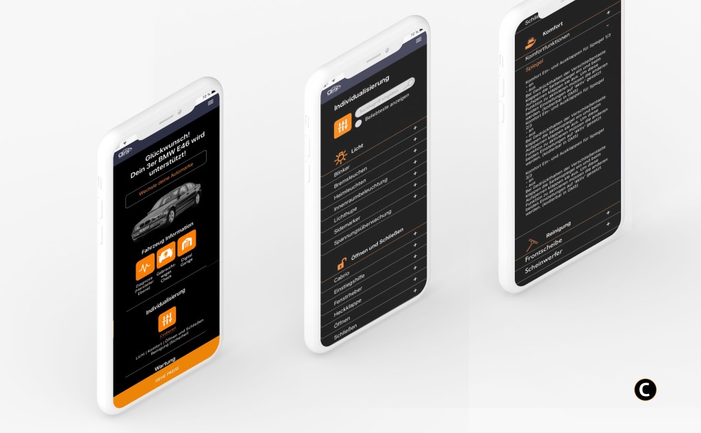 Come up with a UX design concept (mobile only) how we show the user his available features & coding options for his specific car. For this example for a BMW – 3er – E46 on one mobile screen in a user-friendly way.