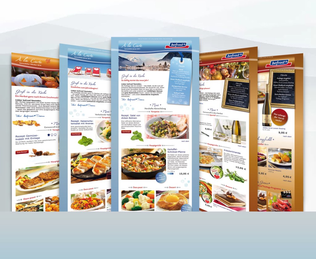 bofrost had different target groups that needed to be addressed individually. With the available data of the shopping behavior of each target group, we created a newsletter template that could be individualized accordingly. We wanted to transmit how easy and convenient meals are prepared using bofrost products. Therefore, we chose a restaurant menu as an opener. The choice of the imagery and the tone communicated the high quality of the products. The segments of the newsletter were created to be easily adapted for every new newsletter as well as the different target groups and resulted in a clear increase in sales.
