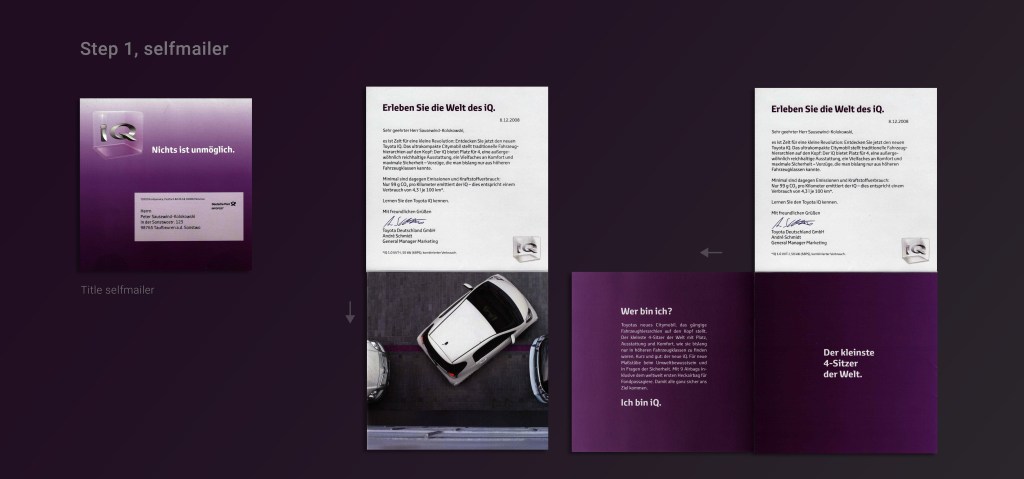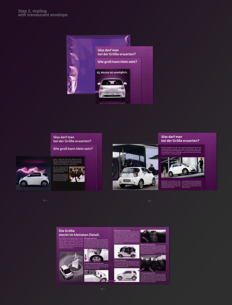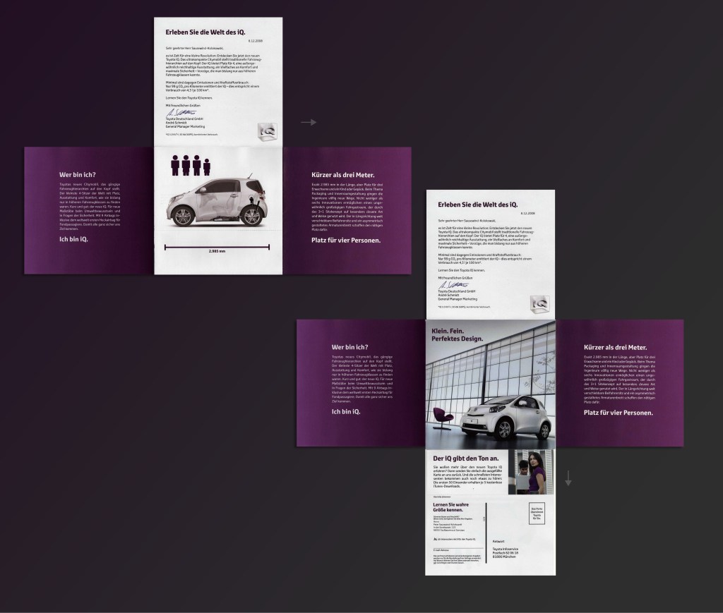 With the new Toyot iQ new standards regarding space in a compact car were being set. A 2-Step mailing was to be developed to communicate as part of a launching campaign. Two features were to be highlighted. Its size, being the the smallest car in the world with 4 seats and its environmental friendliness.