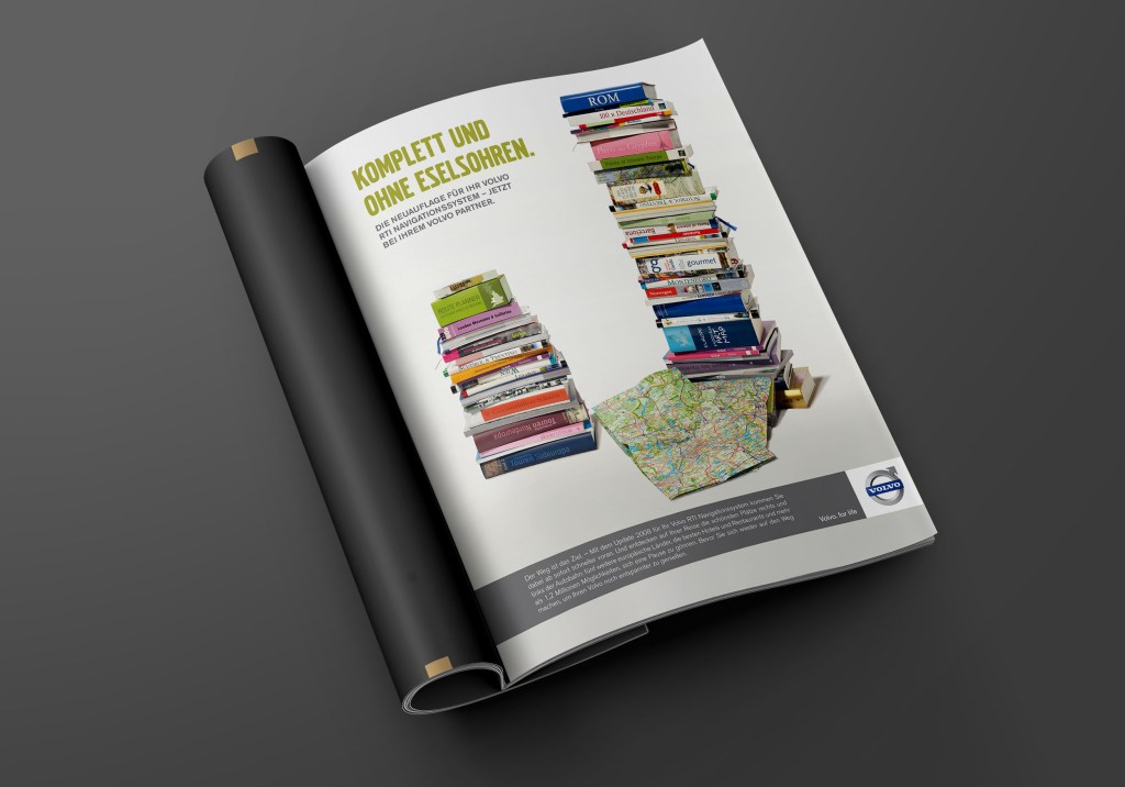 Volvos new navigation system with added features and a bigger range of maps was being launched and need to be promoted. We developed a key visual that communicated the added value in a simple and charming way by showing how all the added information would translate into books and maps. The key visual was used to promote the update in different channels. Ads were published in magazines and mailings were sent out via mail and email.